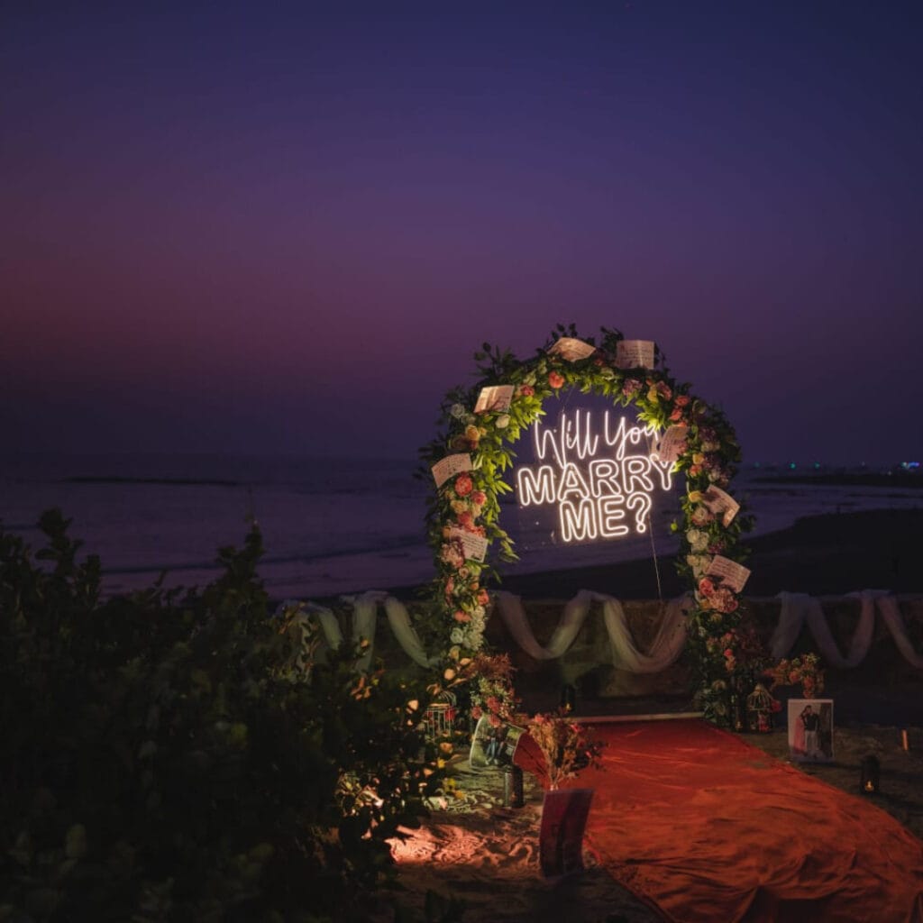 The cost depends on your theme, beach proposal planning, rooftop proposal, or indoor proposal and the scale of décor and customisation. Spaces of Solitude offers flexible packages designed to suit every budget and vision.