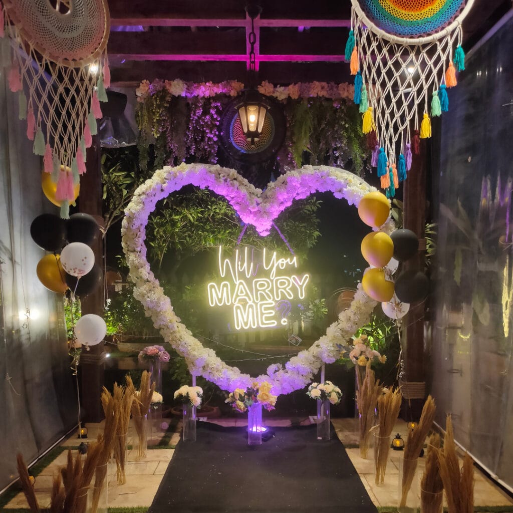 Personalisation has become the heart of every setup. Instead of generic décor, planners design proposals that reflect the couple’s story. It could be recreating their first café date, adding handwritten letters along a candle walkway, projecting travel memories on a backdrop, or using polaroids that lead to the proposal spot. Every detail is chosen intentionally — making the proposal emotionally rich, visually timeless, and uniquely theirs.