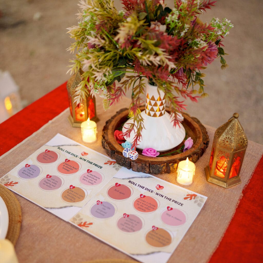 Instead of grand décor, minimalist setups focus on emotional depth. Soft neutral tones, warm lights, and intentional details take centre stage. A sheer drape, a small cluster of candles, a bouquet, and a handwritten letter can be far more powerful than a massive installation.
