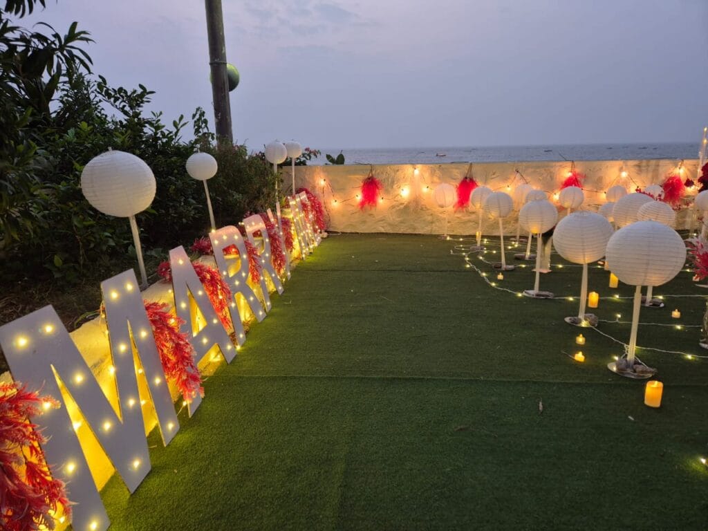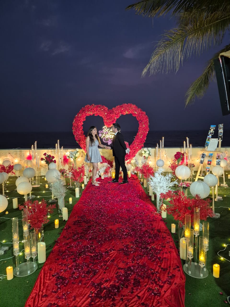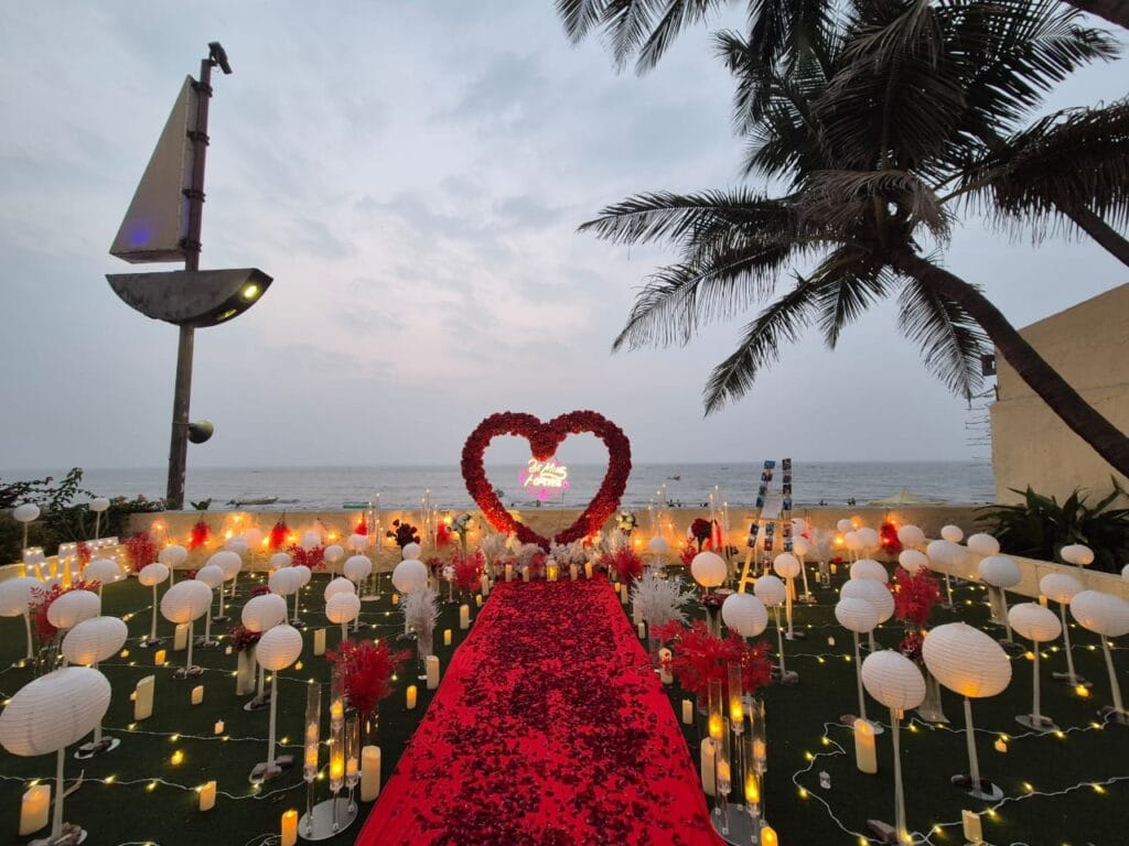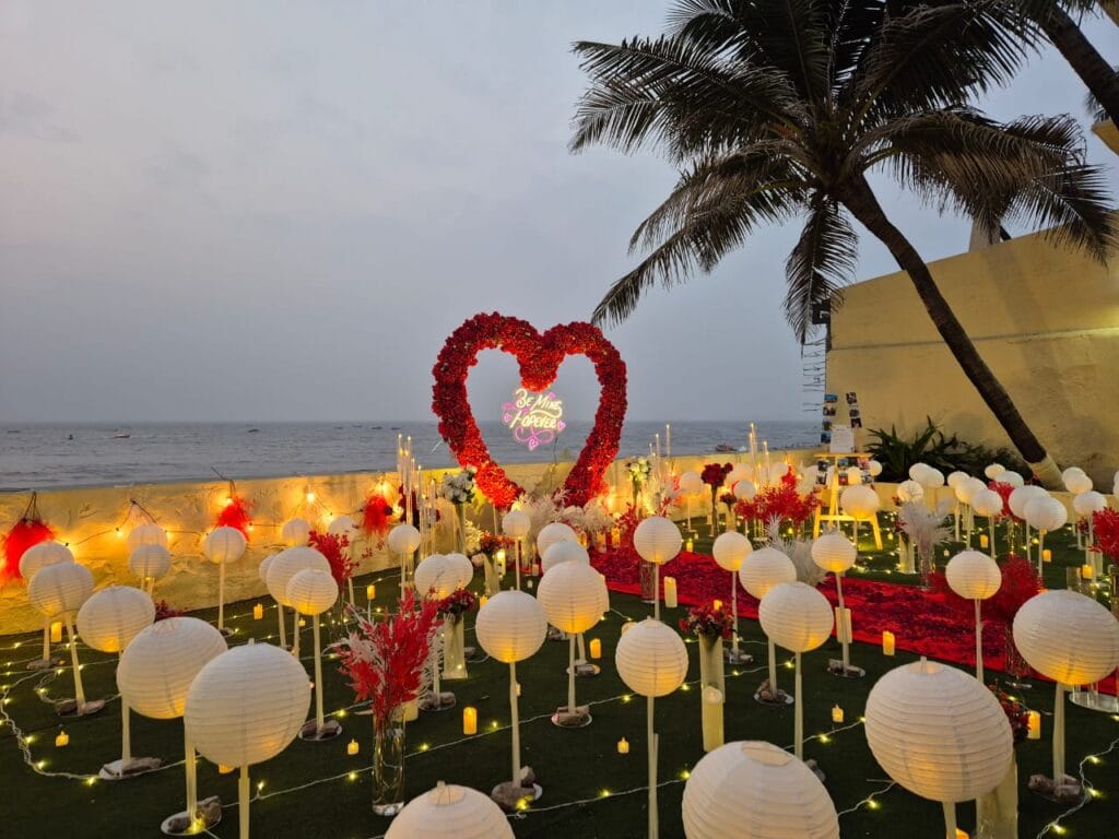 Discover 'Ocean of Love,' the quintessential beachside dinner date destination designed for romance. Nestled on a secluded stretch of sand, this intimate setup is decked in elegant red and white decor, with a grand heart-shaped floral backdrop and glowing 'Marry Me' LED letters setting a breathtaking scene. The exclusive sundowner spot, away from the crowds, offers a tranquil ambiance perfect for heartfelt proposals. Book 'Ocean of Love' now for a magical evening where the ocean whispers and love shines bright.