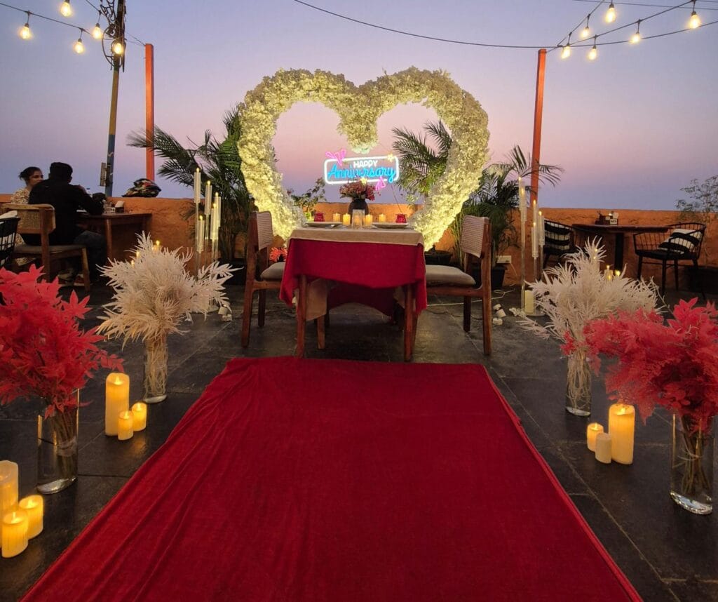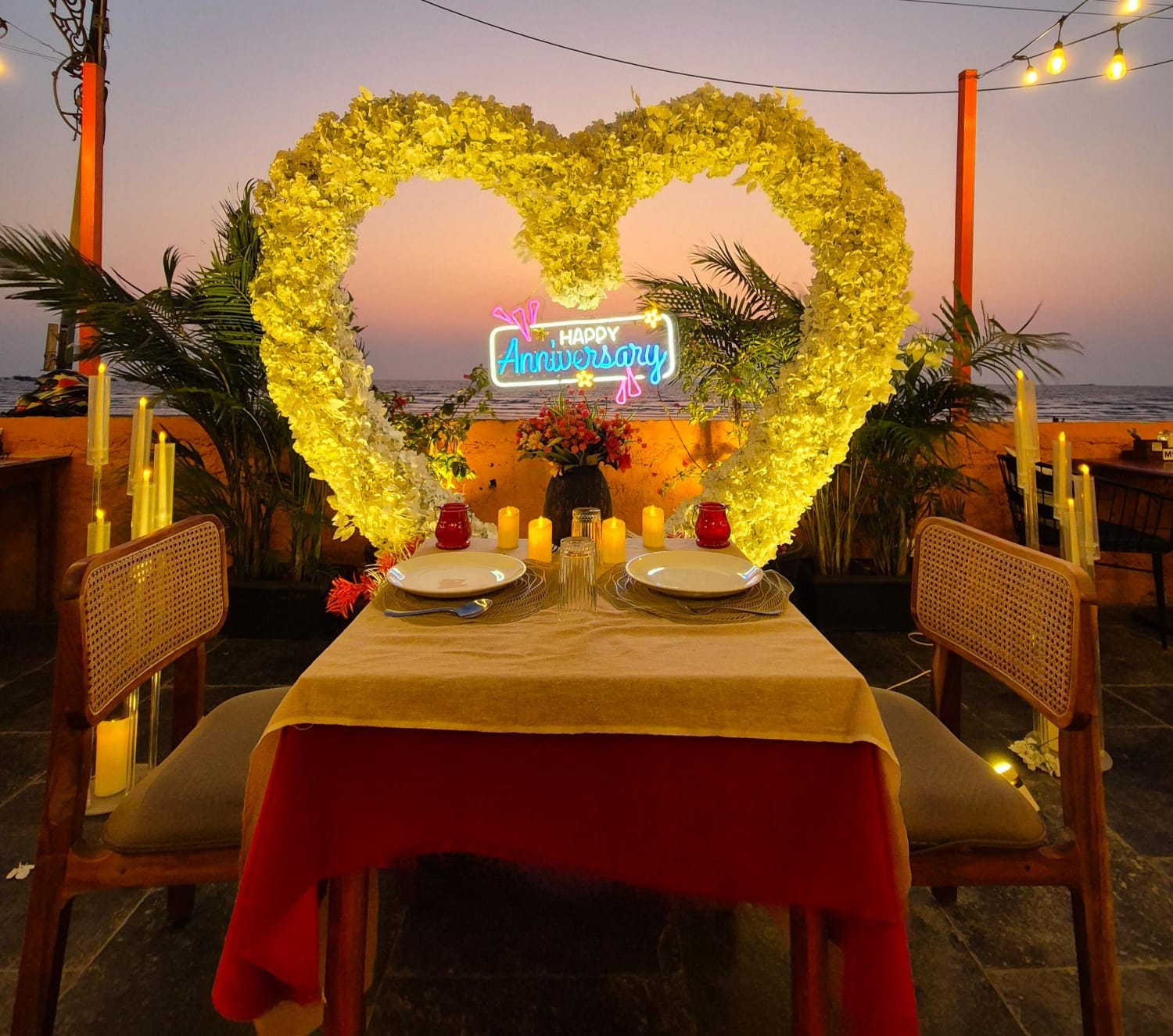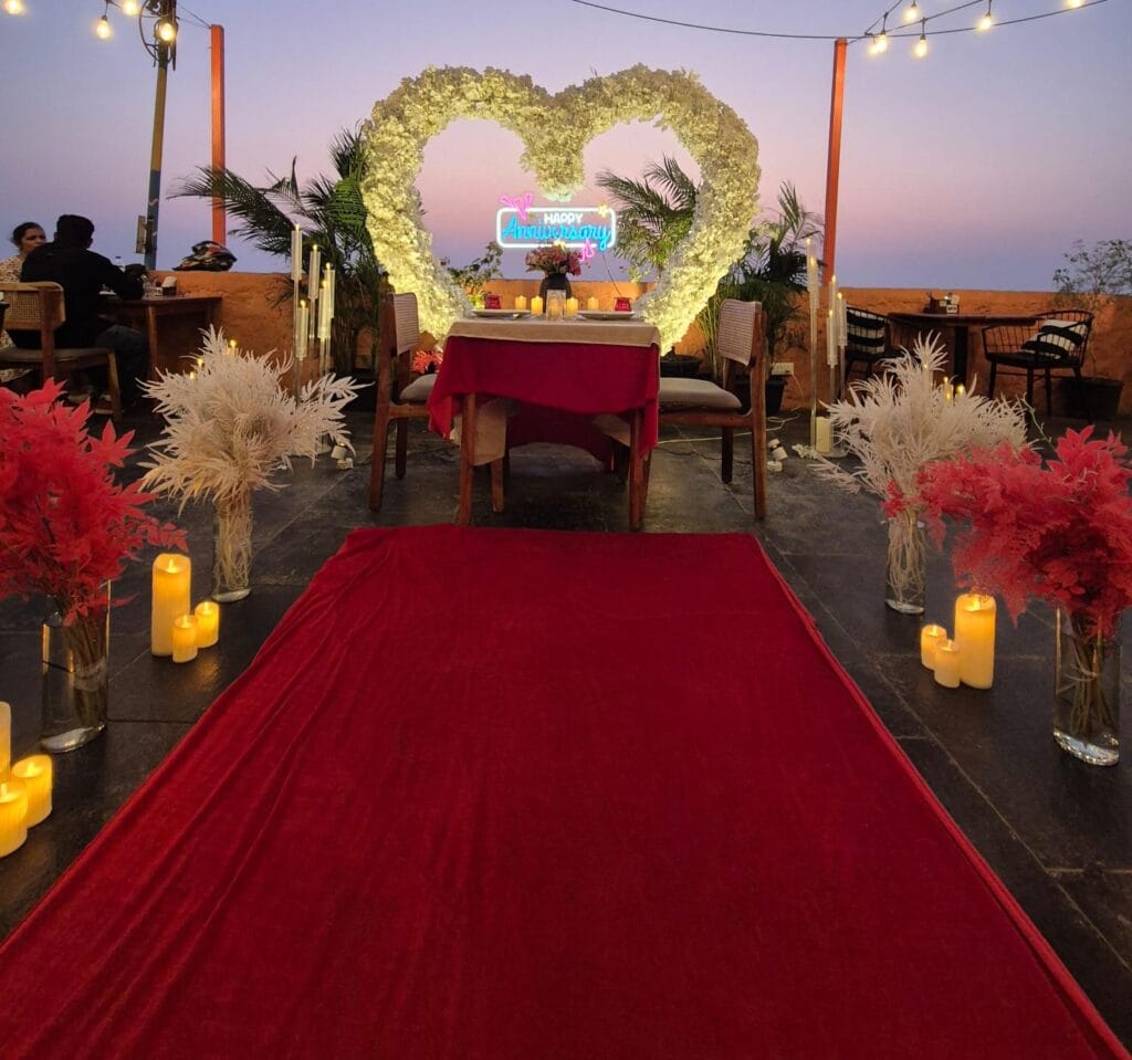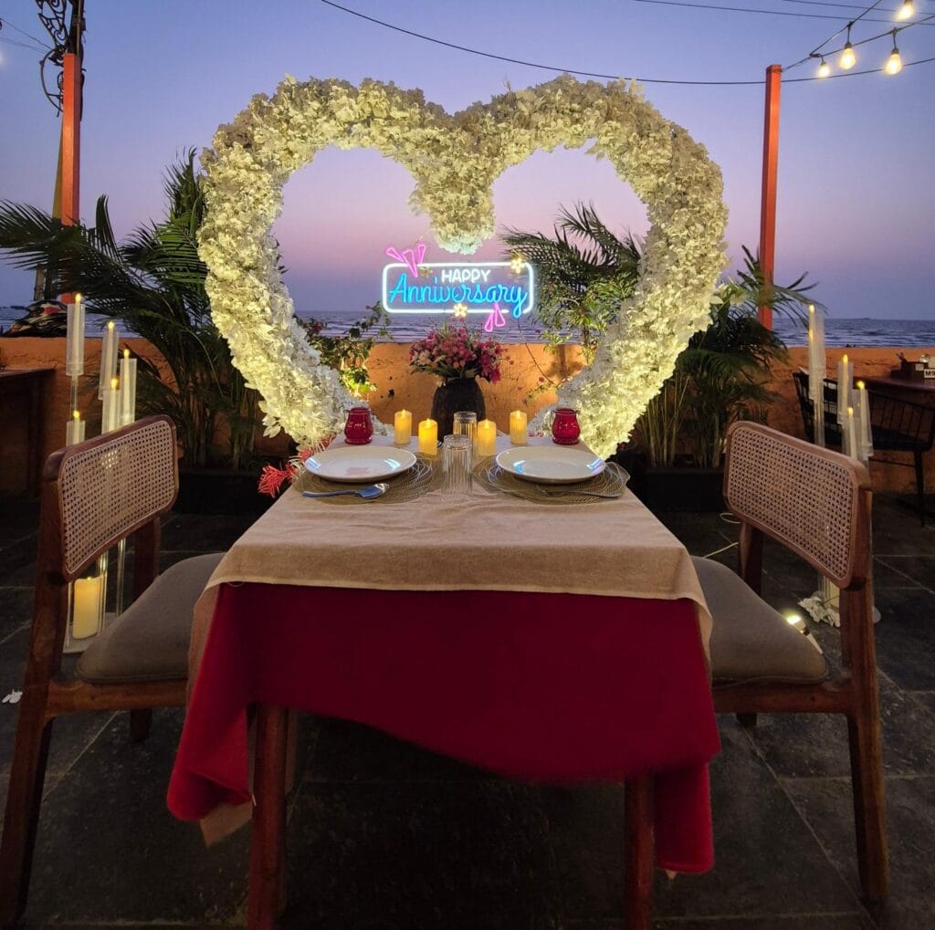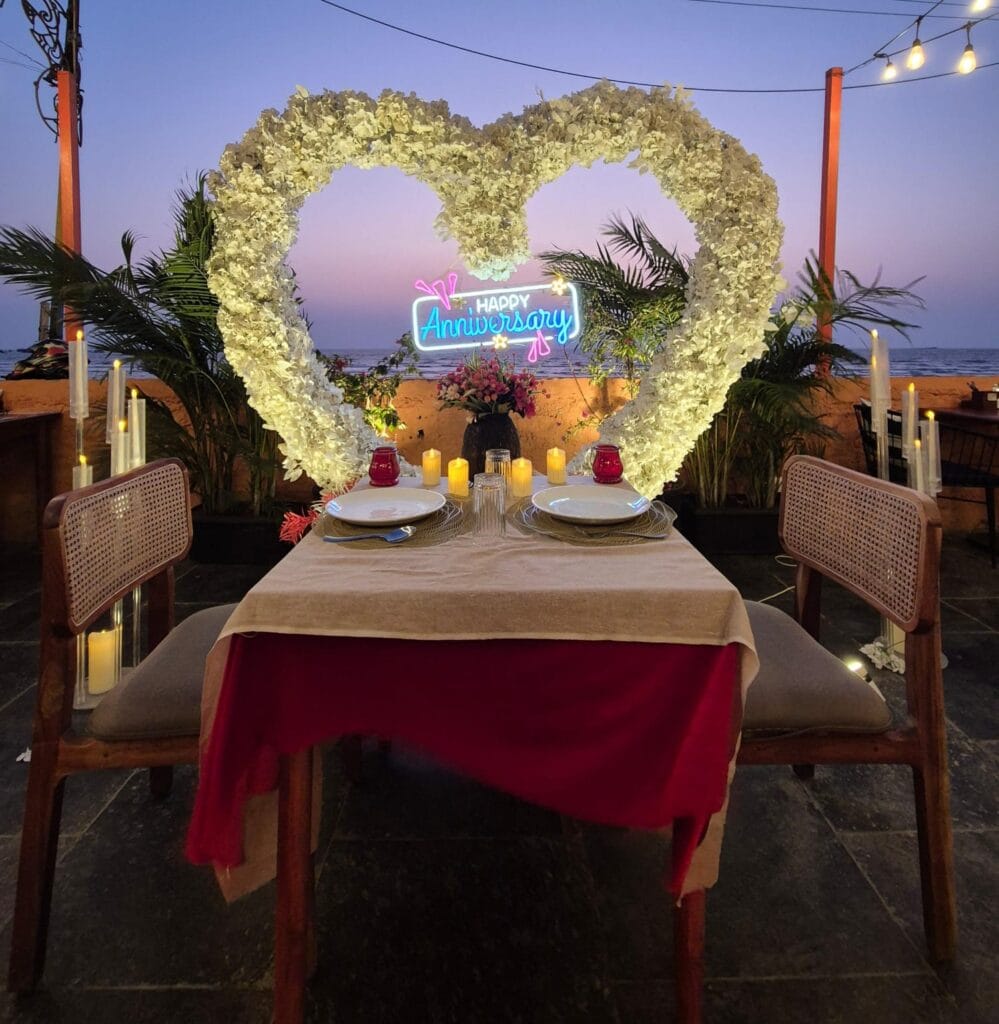 Discover 'Ocean of Love,' the quintessential beachside dinner date destination designed for romance. Nestled on a secluded stretch of sand, this intimate setup is decked in elegant red and white decor, with a grand heart-shaped floral backdrop and glowing 'Marry Me' LED letters setting a breathtaking scene. The exclusive sundowner spot, away from the crowds, offers a tranquil ambiance perfect for heartfelt proposals. Book 'Ocean of Love' now for a magical evening where the ocean whispers and love shines bright.