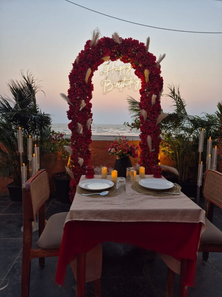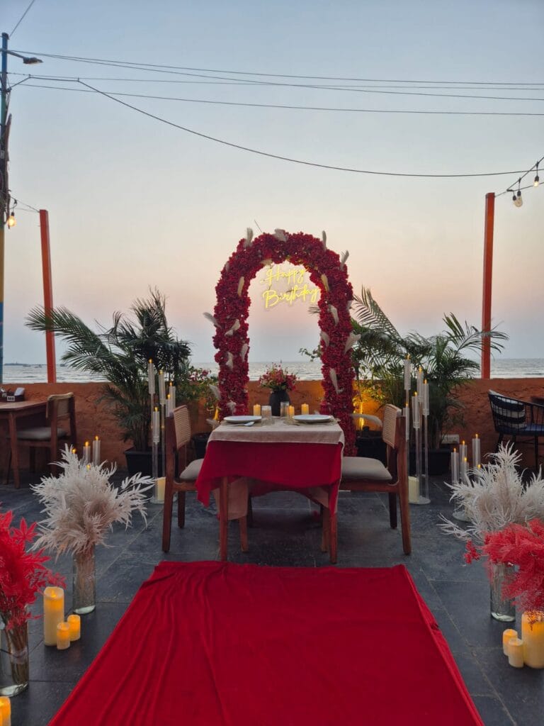 Discover 'Ocean of Love,' the quintessential beachside dinner date destination designed for romance. Nestled on a secluded stretch of sand, this intimate setup is decked in elegant red and white decor, with a grand heart-shaped floral backdrop and glowing 'Marry Me' LED letters setting a breathtaking scene. The exclusive sundowner spot, away from the crowds, offers a tranquil ambiance perfect for heartfelt proposals. Book 'Ocean of Love' now for a magical evening where the ocean whispers and love shines bright.