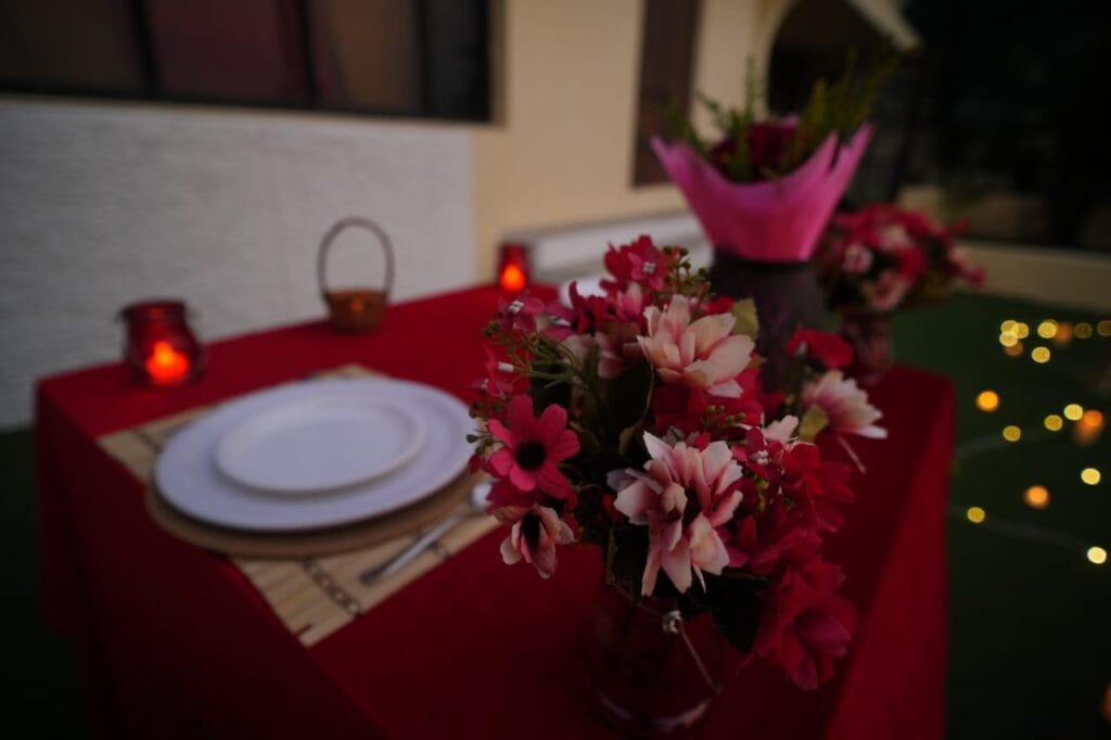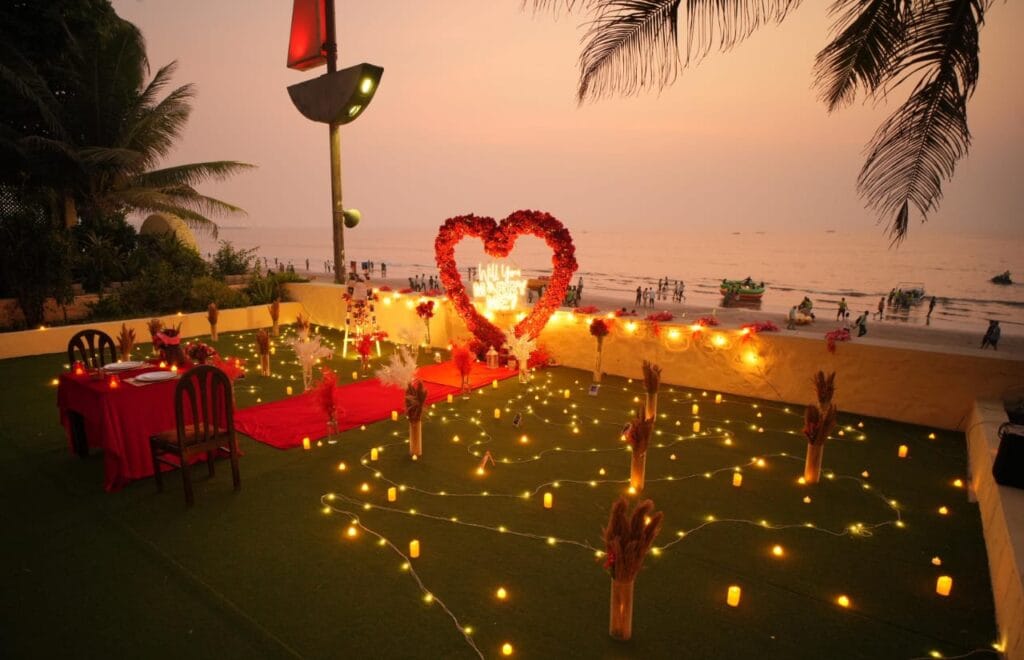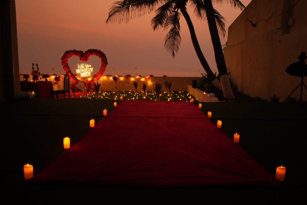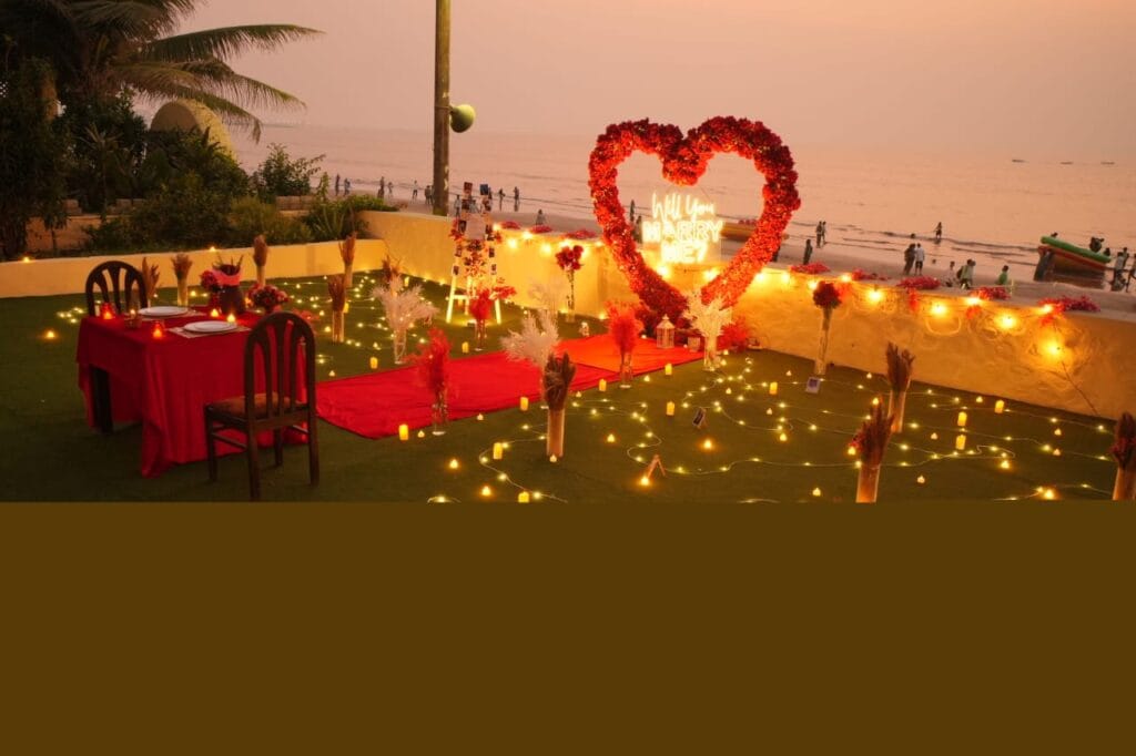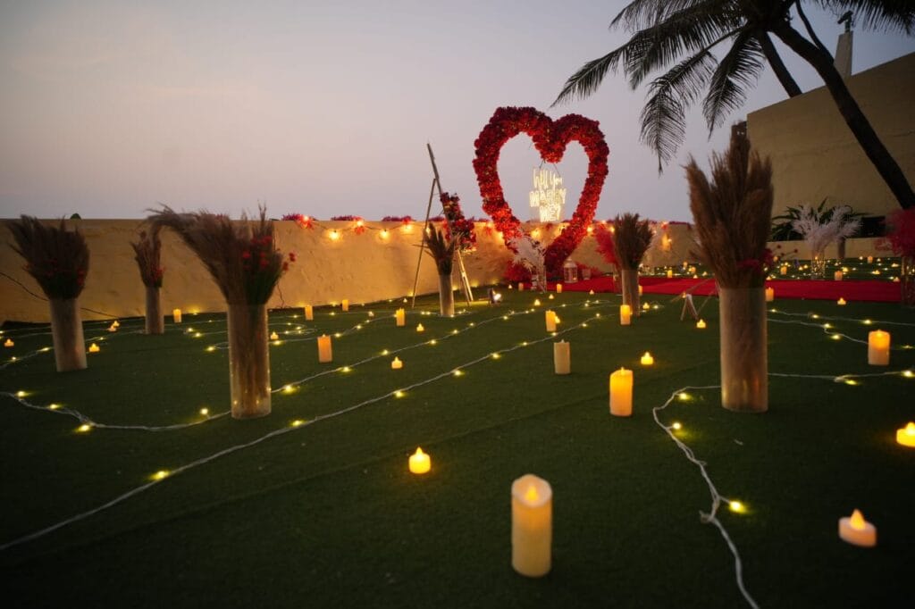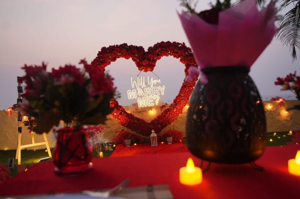 Discover 'Ocean of Love,' the quintessential beachside dinner date destination designed for romance. Nestled on a secluded stretch of sand, this intimate setup is decked in elegant red and white decor, with a grand heart-shaped floral backdrop and glowing 'Marry Me' LED letters setting a breathtaking scene. The exclusive sundowner spot, away from the crowds, offers a tranquil ambiance perfect for heartfelt proposals. Book 'Ocean of Love' now for a magical evening where the ocean whispers and love shines bright.