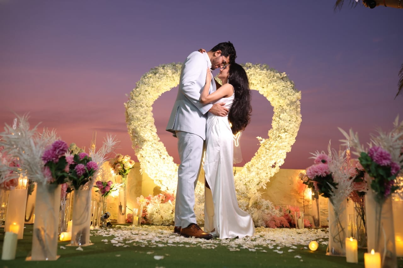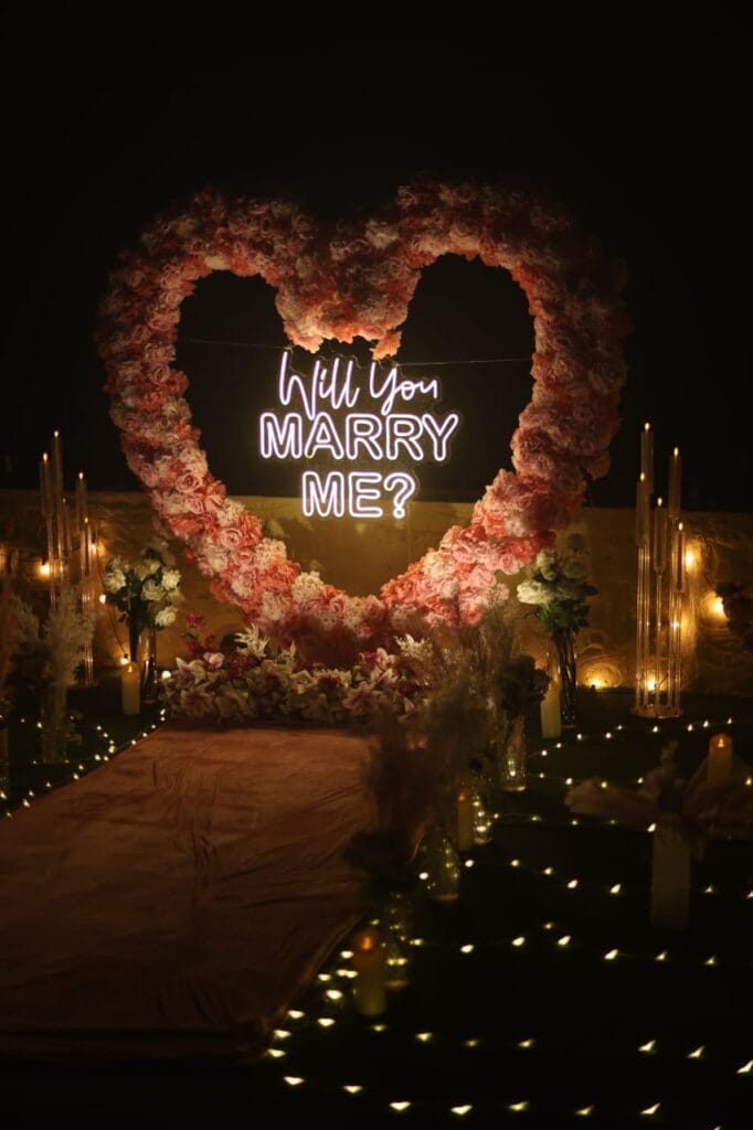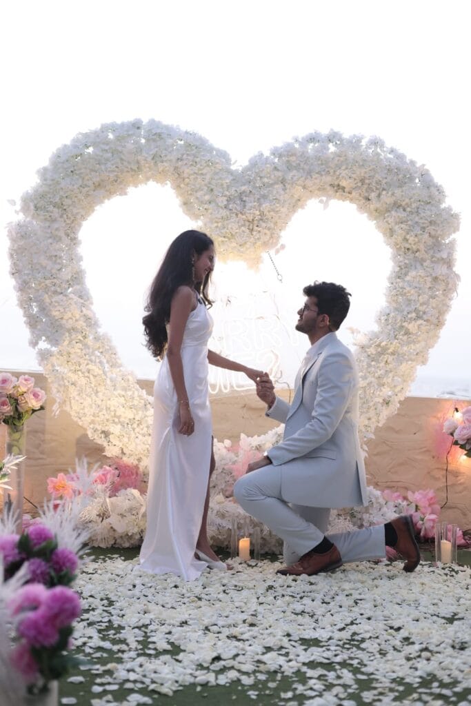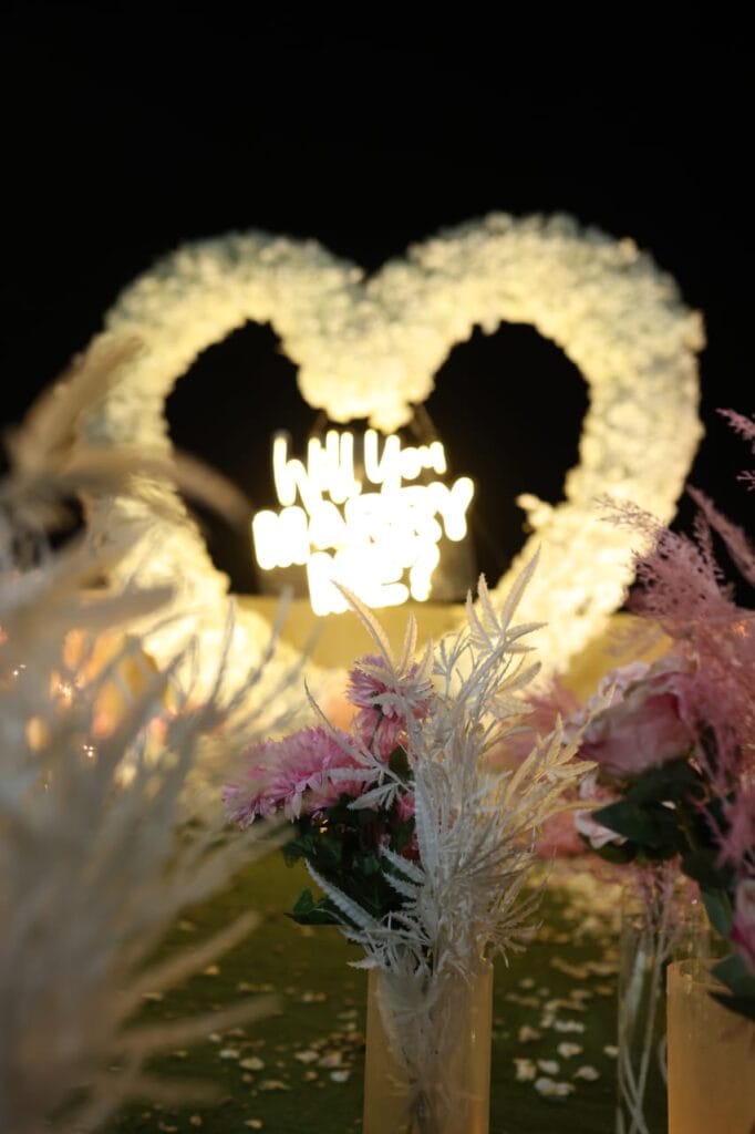 Discover 'Ocean of Love,' the quintessential beachside dinner date destination designed for romance. Nestled on a secluded stretch of sand, this intimate setup is decked in elegant red and white decor, with a grand heart-shaped floral backdrop and glowing 'Marry Me' LED letters setting a breathtaking scene. The exclusive sundowner spot, away from the crowds, offers a tranquil ambiance perfect for heartfelt proposals. Book 'Ocean of Love' now for a magical evening where the ocean whispers and love shines bright.